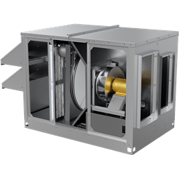 This unit offers many configurations and is designed for easy installation on rooftops or outdoor ground pad mounting. Weatherproof, double-wall insulated housing with hinged access doors allows for easy access to the unit’s wheel, filters, motors, and controls. An optional BMS integration and wheel economizer are also available.